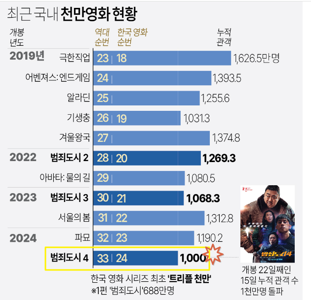 지금까지 국내 개봉작 중 세 편의 천만 영화를 낸 시리즈는 할리우드 영화 '어벤져스' 시리즈가 유일했다. 한국 영화로는 '범죄도시' 시리즈가 첫 사례다.