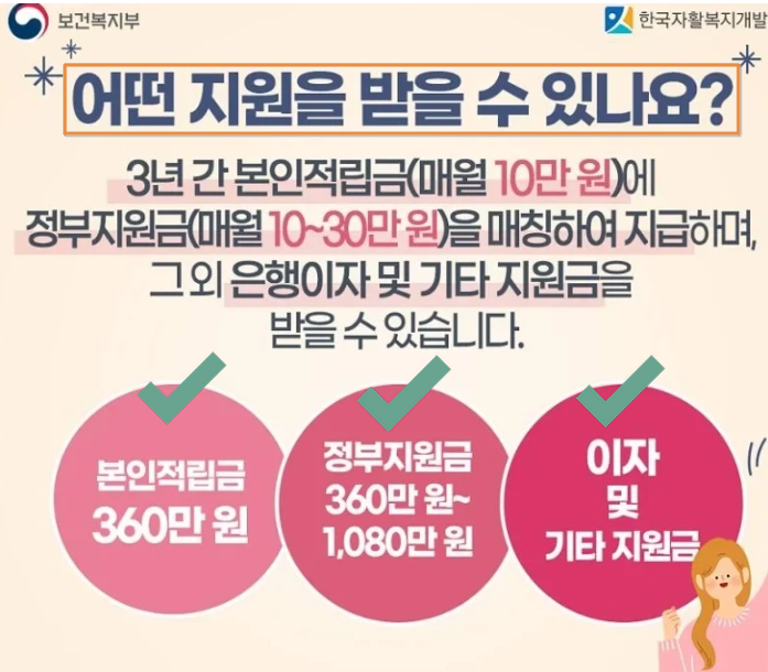 저축 및 정부 매칭 지원: 매월 본인이 10만 원을 저축하면 정부가 일정 금액을 추가로 지원해줍니다. 중위소득에 따라 정부 매칭 지원 금액이 달라집니다.