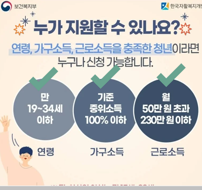 소득 기준: 중위소득 100% 이하인 가구의 청년들이 대상입니다. 중위소득은 해당 연도의 전체 인구 중 소득 순위로 50%에 해당하는 소득을 의미합니다.