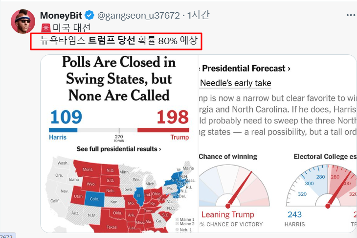 그러다 50% 개표율에서 트럼프가 첫 역전에 성공한 뒤 우위를 지키고 있다. 뉴욕타임스(NYT)는 현재 득표율과 미개표수를 고려해 트럼프가 펜실베이니아에서 승리할 확률을 71%로 평가했다.